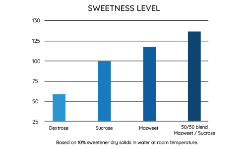 Compared to Sucrose’s relative sweetness of 100, Crystalline Fructose has a relative sweetness of 117. Crystalline Fructose also offers superior sweetness levels and a complementary sweetness profile when blended with sucrose, high-potency and natural-origin sweeteners. Here’s how Crystalline Fructose functions with sucrose and sucralose: